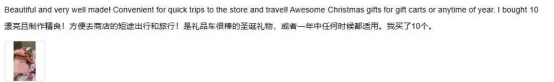 产品的口碑也在评论区持续发酵,不乏“订购 12 个送给同事”“买 10 个当圣诞礼物”“单身派对礼品袋绝佳选择”的留言,“颜色漂亮、做工精良”“耐用轻便、方便携带”等好评,更成为其实现口碑传播的关键。