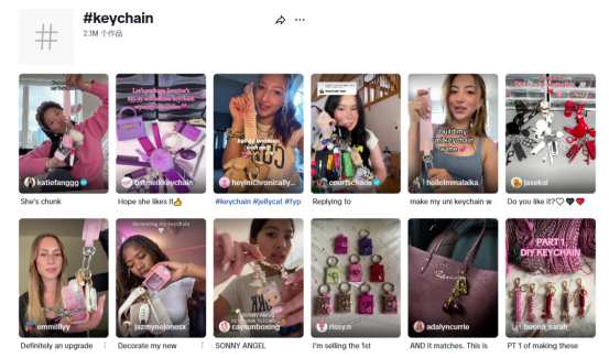 TikTok 美区兴起的“包挂/ 钥匙扣风潮”,更为这类产品搭建了绝佳的传播阵地。平台上#keychain视频标签达 210 万个,小配饰已然成为年轻人彰显个性、社交种草的核心“社交货币”。