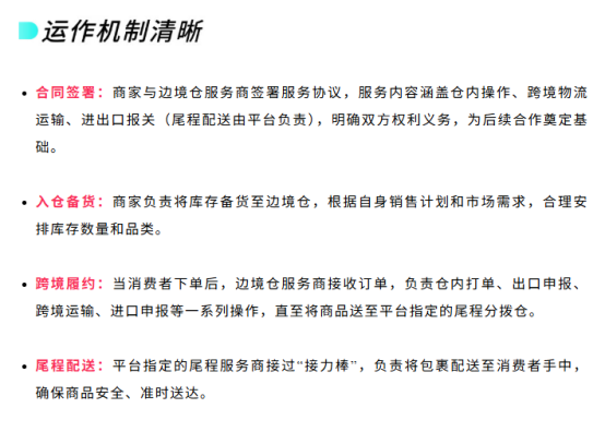 据了解,3PL 边境仓运作模式为:商家先与边境仓服务商签署涵盖仓内操作、跨境运输、进出口报关(尾程配送由平台负责)的服务协议,再根据销售计划将库存备货至边境仓;消费者下单后,服务商承接仓内打单、出口申报、跨境运输、进口申报等流程,将商品送至平台指定尾程分拨仓,最终由平台尾程服务商完成配送。