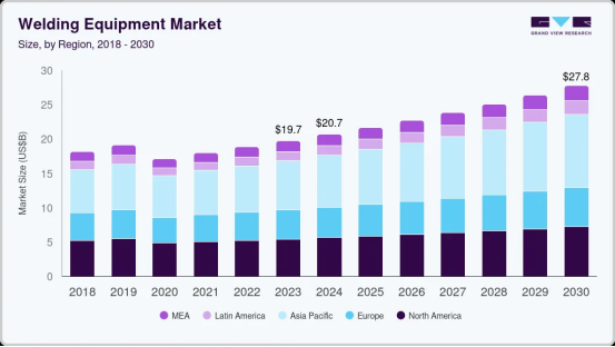 据 grandviewresearch 的研究数据显示:全球焊接设备的市场规模在 2023 年估值为 197 亿美元,预计将在 2030 年达到 278 亿美元,期间的复合年增长率为 5%。