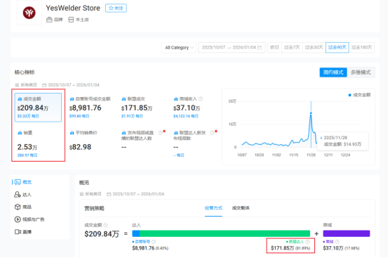 Kalodata 平台的数据显示:YesWelder 的美国本土小店在近 3 个月内累计售出商品 2.53 万件,总成交金额达 209.84 万美元。