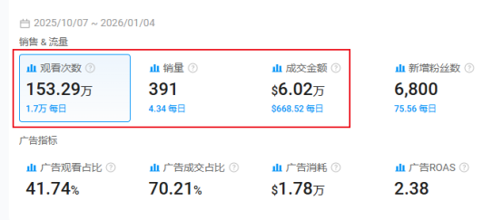 该视频最终斩获了 153.29 万次播放,累计带动 391 笔订单成交,成交金额达 6.02 万美元。