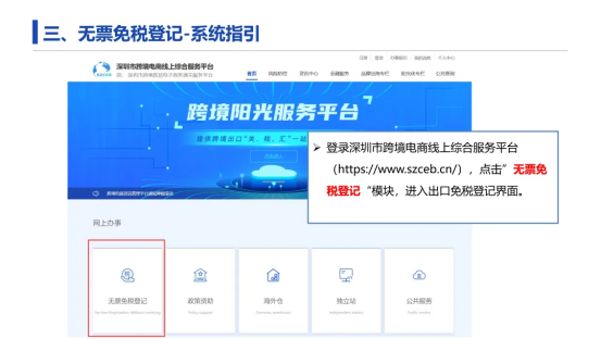 卖家首先需要登录深圳市跨境电商线上综合服务平台(https://www.szceb.cn/),点击”无票免税登记“模块,进入出口免税登记界面。(相关指引如下图所示)