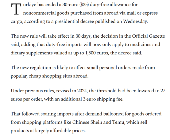 事实上,在土耳其之外,全球范围内对“低价值包裹免税”的制度环境已经在同步收紧。例如,美国在 2025 年 8 月 29 日起,就暂停了对 800 美元以下小额包裹的免税安排。这一变化在逻辑上与土耳其类似,也进一步表明跨境低价正在失去政策基础。