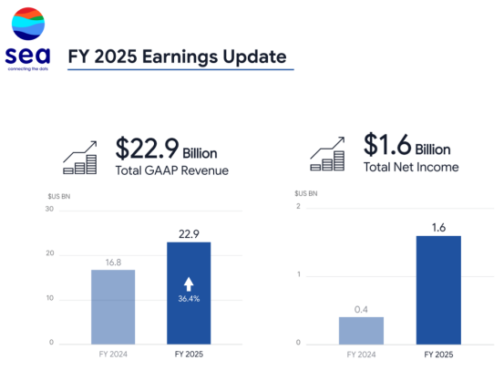 上周,有“东南亚小腾讯”之称的 Sea 正式发布 2025 年第四季度及全年财报,向业界晒出了一份营收与利润双爆发的成绩单。