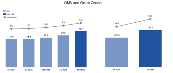 Sea 财报显示,Shopee 在 2025 年第四季度再创历史新高,总订单量达 40 亿单,同比增长 30.5%;商品交易总额(GMV)达 367 亿美元,同比增长 28.6%,证明了 Shopee 在东南亚电商市场的用户活跃度与交易规模持续扩张。