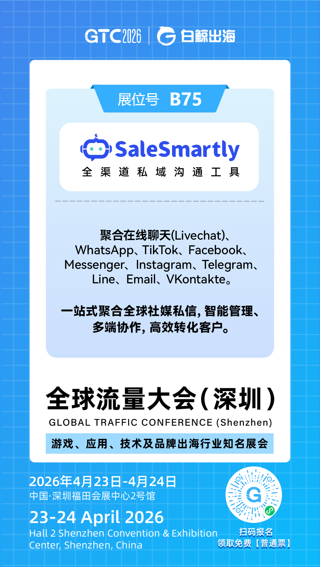 SaleSmartly诚邀各位跨境出海从业者莅临展会现场,体验全渠道客户增长解决方案,与行业专家面对面交流出海运营痛点,解锁各种赛道的高效增长方法。