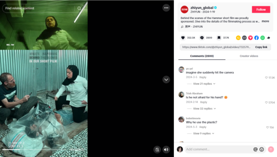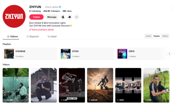 在其 TikTok 官方账号 @zhiyun_global 的页面上,超过 40 万粉丝贡献了高达 200 万次的点赞。翻看内容不难发现,这里几乎没有传统意义上的硬广,取而代之的是一系列引人入胜的“幕后花絮”:电影级打斗镜头的拍摄揭秘、CRANE 系列的动态跟焦实测、补光灯打造的光影特效教程。