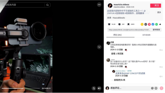 智云联合 @mauricio.videos 等专业视频创作博主,通过纯手法的高难度操作演示,在评论区诱发关于“智云 vs 大疆”的技术辩论,通过口碑发酵强化品牌的专业心智。