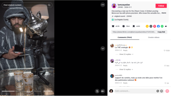 在与开箱博主 @iamzayadae 的合作中展示了反差极大的“精准操作”,用专业级的 CRANE 4 精准倾倒摩洛哥茶,这种将极致性能置于生活化场景的表达方式,瞬间消解了专业器材与摄影小白之间的距离感。