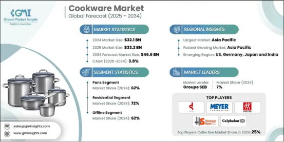 根据数据显示,全球厨具市场在 2024 年规模约为 321 亿美元,并预计从 2025 年的 332 亿美元增长到 2034 年的 466 亿美元,年复合增速约 3.8%。