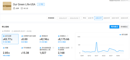 数据显示,Our Place 品牌官方在TikTok Shop的店铺,过去 30 天的成交额约为 43.77 万美元,其中通过联盟达人成交的金额达到 42.96 万美元,占比接近全部销售。