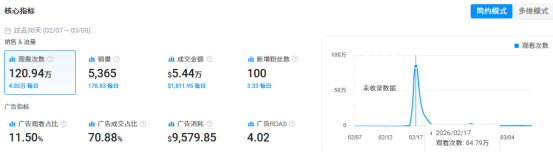 其中,转化效果最好的一条是,她在 2 月 16 日发布的一条保温垫视频。在广告投流的加持下,该视频发布第二天就突破了 87 万播放,截至今日已达到近 120 万播放,直接带动了 5.44 万美元的成交,投产比高达 4.02。
