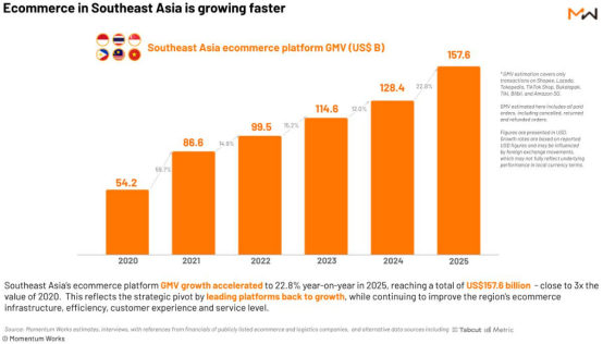 4 月 14 日,Momentum Works发布《Ecommerce in Southeast Asia 2026》报告显示,东南亚电商平台 GMV 在 2025 年达到 1576 亿美元,同比增速回升至 22.8%(见下图),显著优于 2024 年。