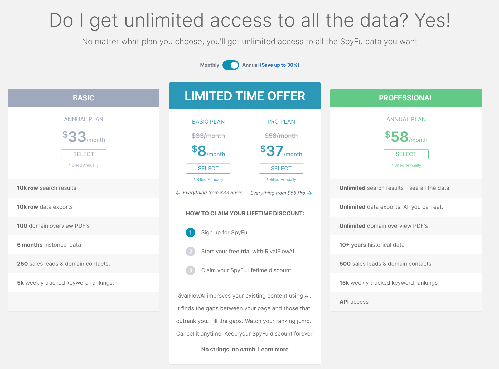 SpyFu 的定价结构相对简单,分为三种不同的计划:基本、专业和团队,月付和年付两种方式,选择年付可享受最高 30% 的折扣。以下是关于 SpyFu 定价的主要信息: